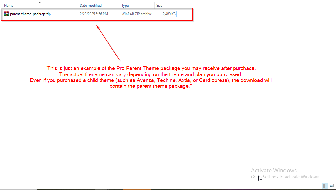This helps you understand that even if you purchased a child theme (like Avenza, Techine, Axtia, or Cardiopress), the ZIP file you download will contain the parent theme package.)