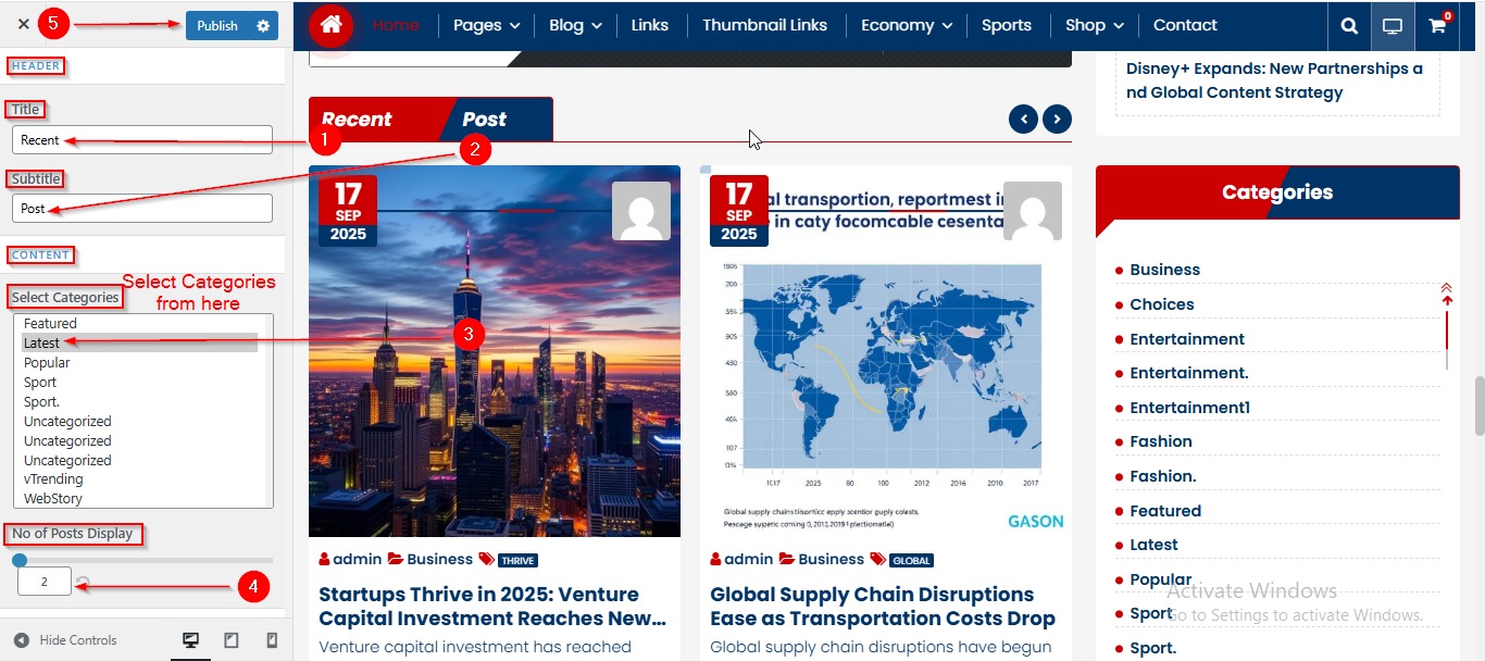 - From the CONTENT Section , select the Categories and No. of posts Display.