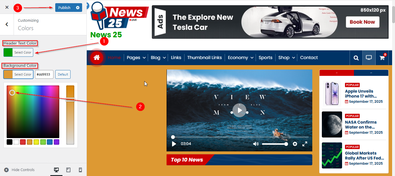- Here, you can manage the Header Text Color and Background Color of the Theme.