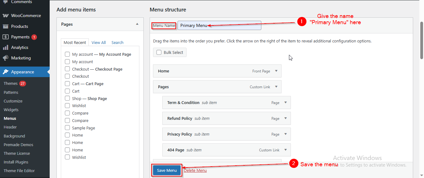 – If it does not exist, click Create a New Menu. - If creating a new menu, make sure to name it exactly Primary Menu and select Display Location as Primary Menu.